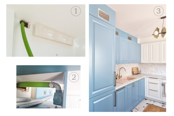 За да се получи баланс и правилно разпределение на въздушния поток, разположихме смукателни решетки в кухнята. Възможността да вградим решетките в декоративната част над кухнята беше идеално решение за нас, защото ни позволи да оставим светлата височина в помещението и да не слагаме окачен таван.