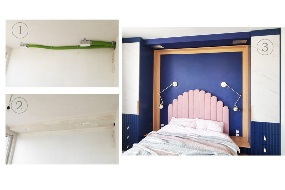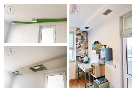 В детската стая разположихме две нагнетателни решетки, които скрихме в декоративен елемент над бюрото. Всички знаем, че за да могат децата да учат пълноценно и умът им да е бодър, е необходимо достатъчно количество кислород. Липсата на кислород води до сънливост и умора. За това подаването на пресен и богат на кислород въздух тук е особено важно.