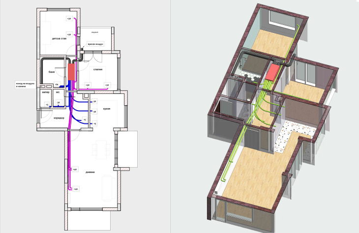 Какво сподели инж. Ивелин Коев, като консултант на обекта: Мария дойде с готова концепция, беше добре запозната със системата за вентилация, но имаше няколко предизвикателства, на които заедно трябваше да намерим решение. Например мястото за разполагане на решетките на фасадата, използването на вертикално трасе за изхвърляне на въздуха. Тя имаше притеснения за шум от главния въздуховод, тъй като той преминава през помещението, но с едно правилно оразмеряване на въздуховода, постигане на ниската скорост и добрата му изолация това притеснение изчезна.