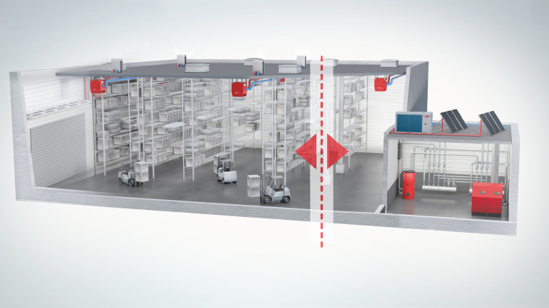 Покривните апарати се разполагат на покрива, а тръбната мрежа минава компактно под покривното пространство и достига до техническото помещение с енергийните източници, разположено в самата сграда. За реновирани сгради или нови складове, които пестят вътрешното си пространство, е възможно също да се изгради и външно котелно CabinSlim, тип контейнер, което да бъде разположено до сградата или на покрива.