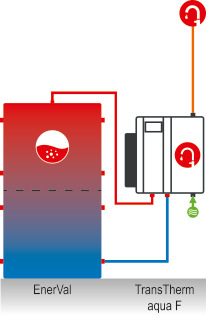 Буферният резервоар EnerVal се пълни изключително с вода за отопление и играе решаваща роля за свързването на производството и потреблението на топлинна енергия. Основната му цел е да управлява тези два аспекта, като балансира разликите между произвежданата и потребяваната енергия, така че цялата отоплителна система да работи по икономичен и екологичен начин. В този контекст ключов аспект е междинното буферно съхраняване на излишната топлина, например тази, която се получава чрез слънчева инсталация през деня и се изхвърля, когато е необходима. По този начин буферният резервоар отделя производството на топлина от нейното потребление по отношение на времето и хидравликата.