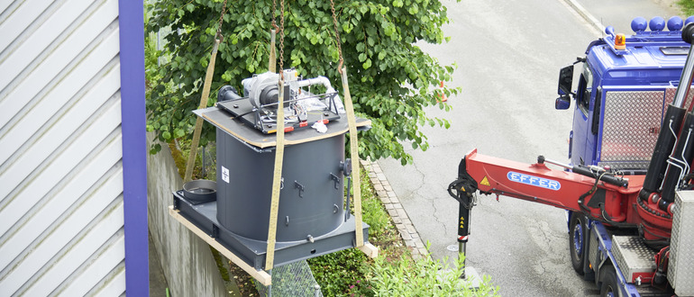 Важен момент е денят, в който е инсталиран котелът. Hoval UltraGas 850 се доставя рано сутринта. Кран вдига газовия котел в мазето. Всички, които участват в планирането, са на място: клиентът Бенджамин Гертцнер, координаторът на Hoval Джузепе Кампанела и също ръководителят на проекта Паскал Мюри от Kocher Heizungen AG, който извършва предстоящата инсталационна работа. Можете да усетите взаимното доверие, което се е развило между клиента и Hoval по време на процеса на оценка и планиране. Gärtzner е убеден, че е направил най-добрия избор: газовият котел, работещ с природен газ, предлага ефективна горивна технология от последно поколение. От отговорност към околната среда.
